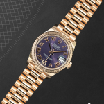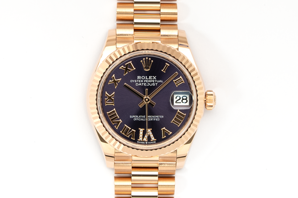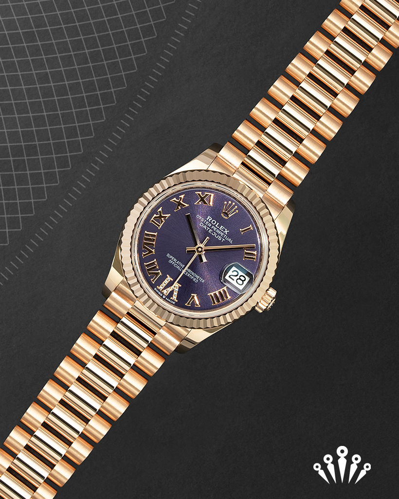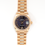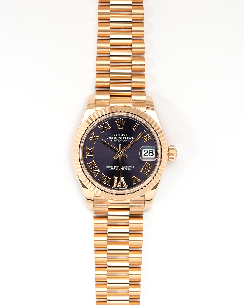 The Rolex Datejust 31 (Ref. 278275) with a stunning purple dial is an exquisite expression of elegance and sophistication. Housed in a 31mm Everose gold case, this timepiece combines timeless design with contemporary charm. The fluted bezel, a signature feature of the Datejust collection, adds a touch of classic refinement, while the vibrant purple sunray-finished dial captures attention with its luxurious allure. Roman numerals and a luminescent display provide an easy reading experience, complemented by a date window at 3 o’clock with the iconic Cyclops lens for magnification.