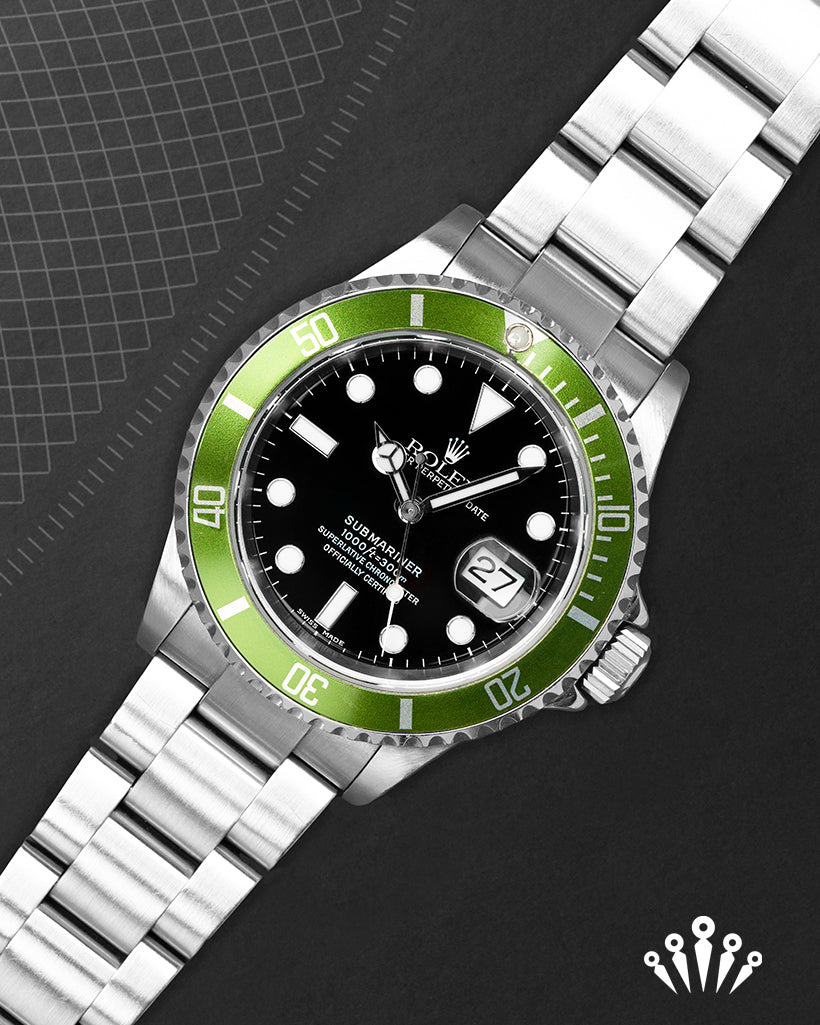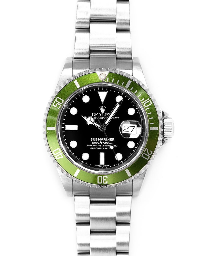 We are proud to present to you this very rare 50th Anniversary Submariner Date ‘Kermit’ This is certainly not your average 16610LV, This is one of the first ones Rolex has ever produced and as you may know, the first versions are always the most valuable and collectible versions.